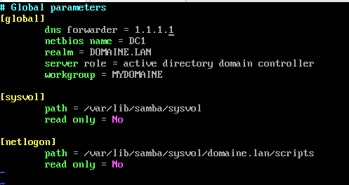Dans la ligne qui suit, vous penserez à changer à la fois le nom du royaume kerberos, et le nom court du domaine (nom netbios):